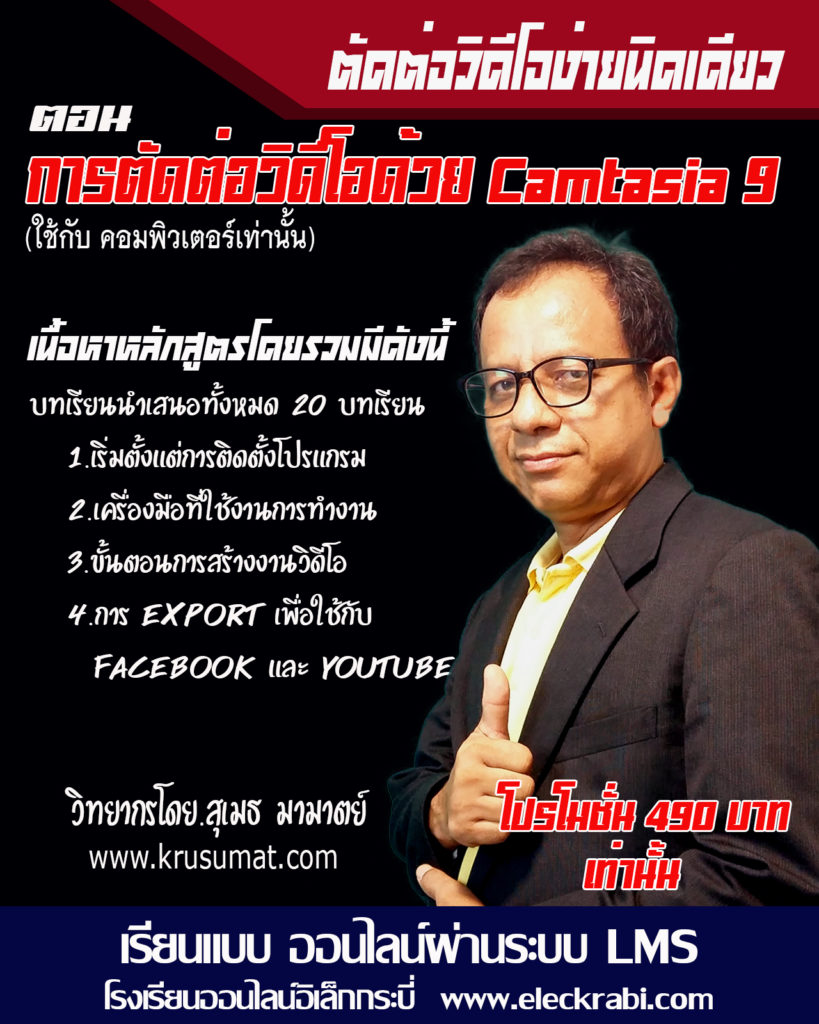 คอร์สตัดต่อวิดีโอด้วยโปรแกรม Camtasia 9 1.การติดตั้งโปรแกรม Camtasia2.ทำความรู้จักกับเครื่องมือในการตัดต่อวิดีโอ3.การเพิ่มไฟล์เสียงแอฟเฟคใน Library ของโปรแกรม4.การตั้งค่าเริ่มต้นก่อนการตัดต่อวิดีโอ5.การนำไฟล์ภาพนิ่งและภาพเคลื่อนไหวมาใช้6.การสร้างสีพื้นและการเติมสีของวิดีโอ7.การใส่อักษรและกราฟิกบนวิดีโอ8.การใส่เอฟเฟ็คระหว่างเฟรมภาพ9.การสร้างเส้นเพื่อขีดเส้นใต้ข้อความในวิดีโอ10.การสร้างตัวอักษรแบบคาราโอเกะในวิดีโอ11.การปรับสีและแสงในวิดีโอที่ถ่ายมา12.การปรับระดับของเสียง13.การเจาะสีพื้นหลังทิ้งเพื่อใส่พื้นหลังใหม่ทั้งภาพเคลื่อนไหวและภาพนิ่ง14.การแคปเจอร์หน้าจอพร้อมกับกล้อง15.การปรับเสียงและขนาดภาพที่ได้จากการแคปเจอร์16.การใส่ Logo ในวิดีโอ17.การใส่คำบรรยายในวิดีโอ18.การเพิ่มเสียงบรรยายในวิดีโอทำเชิงสารคดี19.การ Export File เพื่อใช้งานใน Youtube หรือ Facebook20.ใบงานและตัวอย่างการสร้างคอนเทนต์ด้วยโปรแกรม camtasia #ค่าเรียนคอร์สออนไลน์ ปกติ 900 บาท ช่วงโปรโมชั่นลดเหลือ 490 บาท #โอนบัญชีชื่อ สุเมธ มามาตย์ ธนาคาร กสิกรไทย 013-8-13922-0 ชื่อ – สกุล เบอร์โทรศัพท์ Email ที่อยู่ วันที่ทำการโอนเงิน เวลาในการโอนเงิน จำนวนเงินที่โอน Submit Form