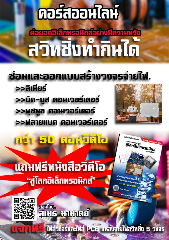 ฟอร์มสมัคร คอร์สออนไลน์ “สวิทชิ่งทำกินได้” ฟอร์มสมัคร คอร์สออนไลน์ "สวิทชิ่งทำกินได้" เนื้อหาและบทเรียนในหลักสูตร ที่จำเป็นจะต้องเรียน (อาจจะเปลี่ยนแปลงเพิ่มเติมตามเหตุการณ์จริง) มากกว่า 50 ตอนในการเรียนรู้ ตั้งแต่พื้นฐานจนสามารถประกอบอาชีพ ซ่อมและสร้างสวิทชิ่ง ได้ โดยมีหัวข้อดังต่อไปนี้… บทที่ 1 แหล่งจ่ายไฟฟ้ากระแสตรง1.1.พลังงานและแหล่งจ่ายพลังงานมีกี่ชนิดอะไรบ้าง1.2.แหล่งจ่ายไฟฟ้ากระแสตรงแบบลิเนีย1.3.แหล่งจ่ายไฟฟ้ากระแสตรงแบบ LDO1.4.วงจรแหล่งจ่ายไฟกระแสตรงแบบค่าคงที่1.5.วงจรแหล่งจ่ายไฟกระแสตรงแบบปรับค่าได้1.6.ไอซีและอุปกรณ์กำลังสำหรับสร้างแหล่งจ่ายไฟไฟกระแสตรงบทที่ 2 หลักการบัคบูทคอนเวอร์เตอร์2.1 เทคนิคการควบคุมแรงดันด้วย Buck Converter2.2 เทคนิคการควบคุมแรงดันด้วย Bost Converter2.3 การนำ Buck-Bost มารวมกันเพื่อสร้างเป็น MPPT2.5 อุปกรณ์กำเนิดความถี่สำหรับวงจร buck-bost convertor2.6 อุปกรณ์กำลังและการจัดวงจร สำหรับวงจร buck-bost 2.7 ทรานฟอร์เมอร์ในวงจร buck-bost convertorบทที่ 3 พุชพูลคอนเวอร์เตอร์3.1 หลักการทำงานและการจัดวงจรของ พุชพูล3.2 เหตุผลในการใช้งานวงจร พุชพูล คอนเวอร์เตอร์3.3 อุปกรณ์กำเนิดความถี่ที่ใช้ในวงจรพุชพูล คอนเวอร์เตอร์3.4 อุปกรณ์กำลังและการจัดวงจรสำหรับ วงจรพุชพูล คอนเวอร์เตอร์3.5 ทรานฟอร์เมอร์ที่ใช้ในวงจร พุชพูลคอนเวอร์เตอร์บทที่ 4 ฟลายแบคคอนเวอร์เตอร์4.1 หลักการทำงานและการจัดวงจรของฟลายแบคคอนเวอร์เตอร์4.2 เหตุผลในการใช้งานวงจรฟลายแบคคอนเวอร์เตอร์4.3 อุปกรณ์กำเนิดความถี่ที่ใช้ในวงจรฟลายแบคคอนเวอร์เตอร์4.4 อุปกรณ์กำลังและการจัดวงจรสำหรับ วงจรฟลายแบค 4.5 ทรานฟอร์เมอร์ที่ใช้ในวงจรฟลายแบคคอนเวอร์เตอร์บทที่ 5 เทคนิคการออกแบบและสร้างวงจรโดยใช้เทคนิค LDO พื้นฐาน ลิเนียร์5.1 การทำงานวงจรแบบค่าคงที่5.2 วงจรการทำงานแบบปรับค่าได้5.3 วงจรป้องกันกระแสเกิน5.4 เทคนิคการตรวจซ่อม5.5 ลายวงจรและ PCBบทที่ 6 เทคนิคการออกแบบและสร้างวงจรโดยใช้ เทคนิค บัคบูทคอนเวอร์เตอร์6.1 การอ่านดาต้าชีตอุปกรณ์เพื่อเอามาออกแบบวงจร 6.2 วงจรควบคุมแรงดัน DC to DC convertor6.3 เทคนิคการพันหม้อแปลง6.4 วงจรป้องกัน OCP OVP6.5 ลายวงจรและ PCB บทที่ 7 เทคนิคการออกแบบและสร้างวงจรโดยใช้ เทคนิค พุชพูลคอนเวอร์เตอร์7.1 การอ่านดาต้าชีตอุปกรณ์เพื่อเอามาออกแบบวงจร 7.2 วงจรควบคุมแรงดัน พุชพูลคอนเวอร์เตอร์7.3 เทคนิคการพันหม้อแปลงพุชพูล7.4 วงจรป้องกัน OCP OVP7.5 ลายวงจรและ PCBบทที่ 8 เทคนิคการออกแบบและสร้างวงจรโดยใช้ เทคนิคฟลายแบคคอนเวอร์เตอร์8.1 การอ่านดาต้าชีตอุปกรณ์เพื่อเอามาออกแบบวงจร 8.2 วงจรควบคุมแรงดัน พุชพูลคอนเวอร์เตอร์8.3 เทคนิคการพันหม้อแปลงฟล